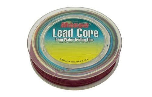"LEAD CORE" Trolling Line. Mason is proud to introduce Lead Core Deep Water Trolling line. This fast sinking line is composed of abrasion resistant Braided Nylon over a flexible lead core. It is color metered every ten yards with non fading dye for exact depth control. This smooth and easy to control line is a must for every deep water fisherman. Available in 12 to 60 pound test, two 100 yard spools connected or 100 yard singles. Also suggested for fly fishing.